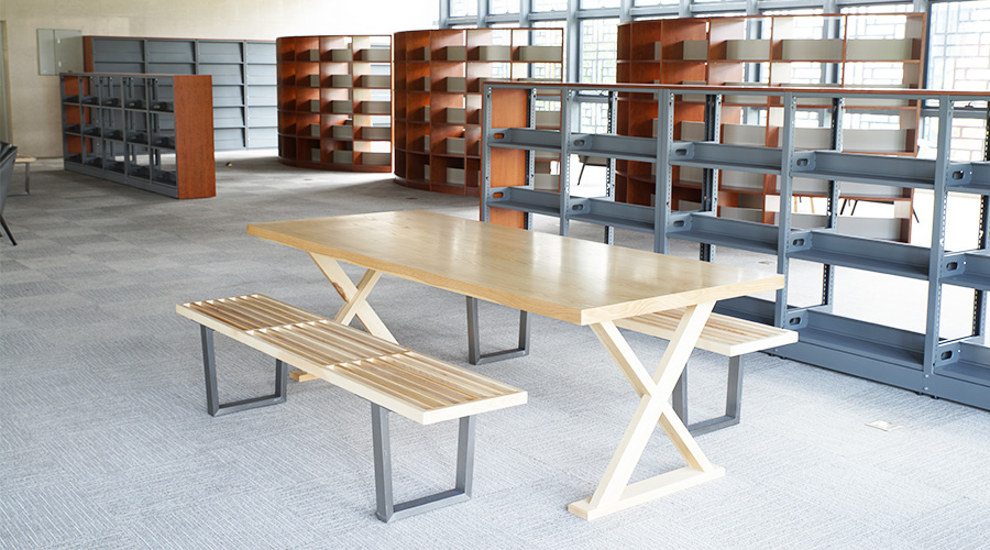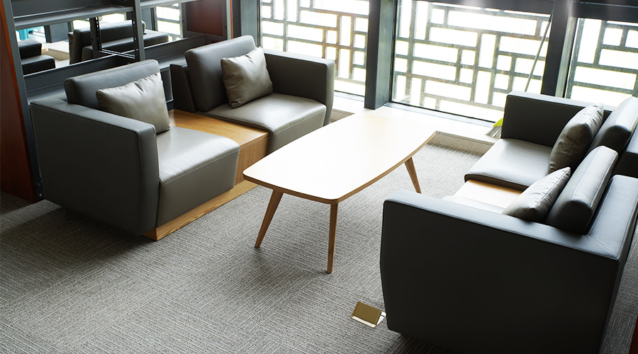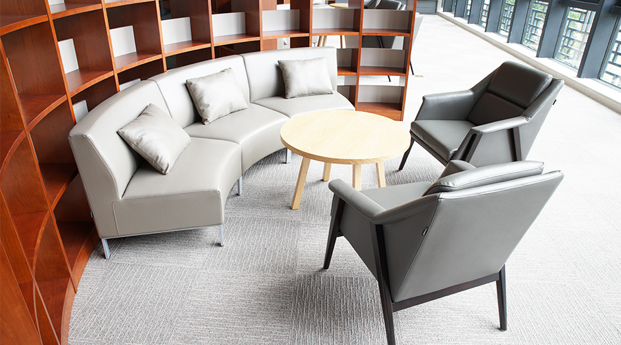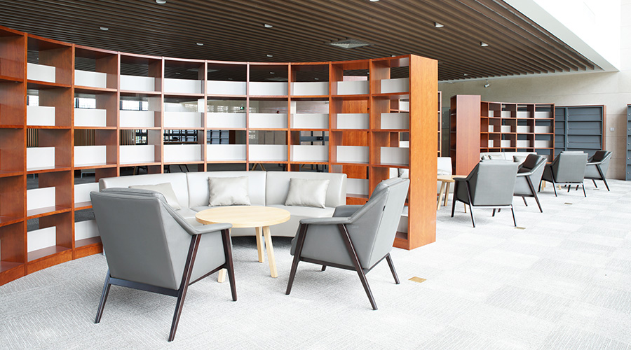 阅览室设计为半封闭隔断书架,可以保证各个区域的相对隐私,洽谈阅读两不误。樱桃天然木皮搭配灰调休闲沙发更显纯粹、自然。