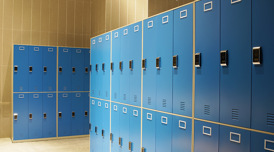 体育馆储物钢柜整齐统一,摒弃传统的机械锁,均使用近场感应自动锁。搭配实木钢脚的条凳方几更显秩序感。