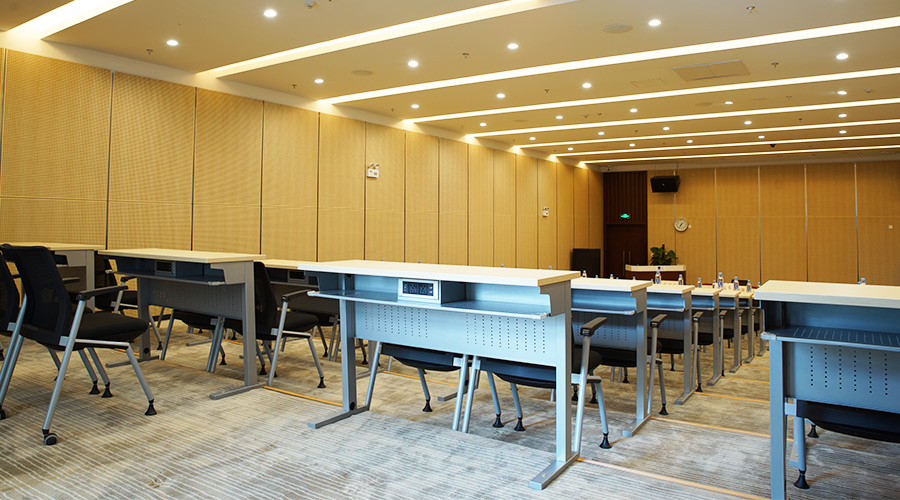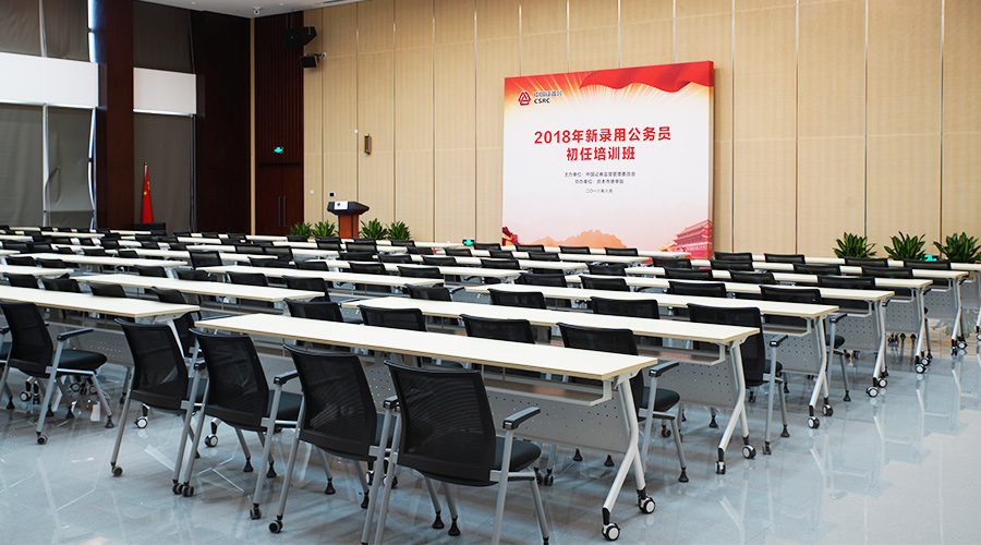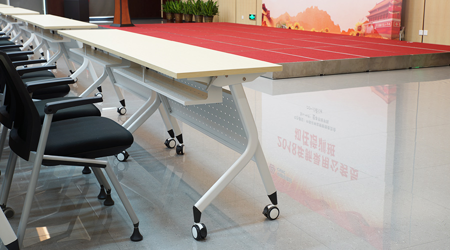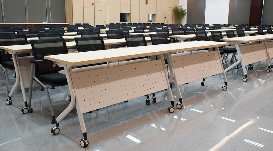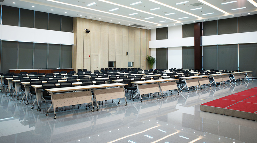 培训桌面使用E0级竹纹三胺板搭配折叠钢架,可灵活的拆分、组合,可广泛用于不同场合。为方便及时的处理工作,阶梯教室每桌柜筒均配有市电和USB充电线盒。